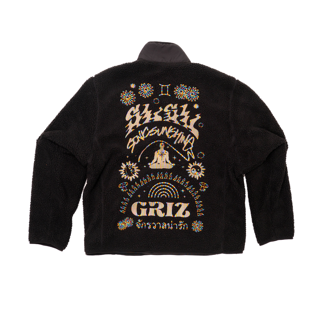 Rainbow variegated thread embroidered on black polar fleece, 100% poly blend, zip up jacket.